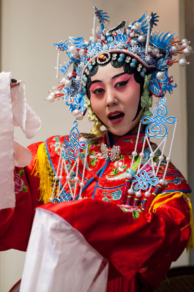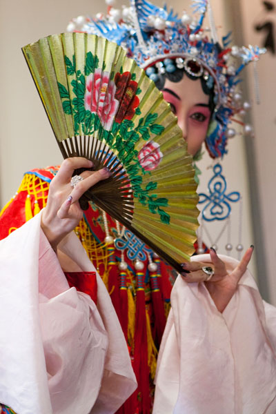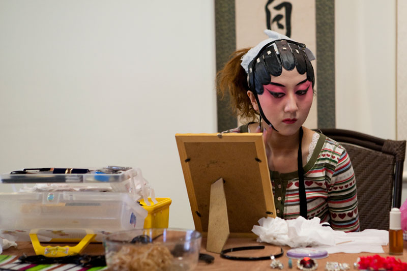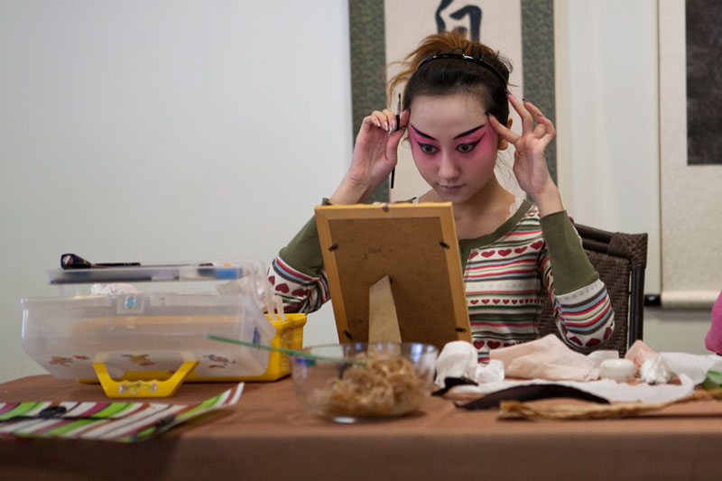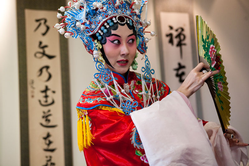 I attended and photographed a Peking Opera workshop designed to help future generations understand and appreciate this ancient custom. The two performers demonstrated the technique of applying their makeup and putting on their costumes in preparation for a performance, and then they demonstrated the Sheng and Dan roles by performing an excerpt from a traditional opera. During their performance, they explained the importance of the gestures, actions, and vocals that are used to enhance the story. In a generation of Chinese youth often obsessed with western culture, Peking Opera is not very popular. But thanks to the dedication of a few individuals committed to its preservation, Peking Opera is gaining renown internationally as troupes travel the world bringing this ancient custom to other countries.