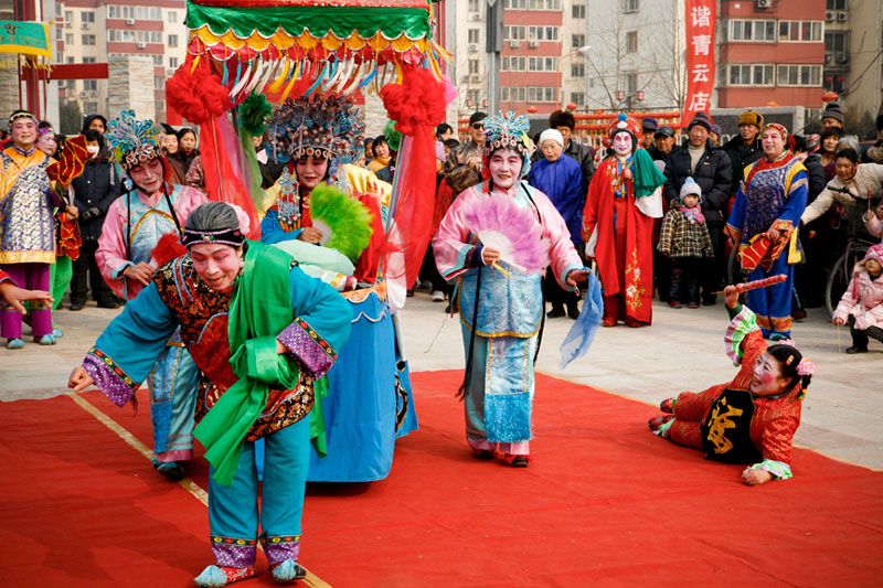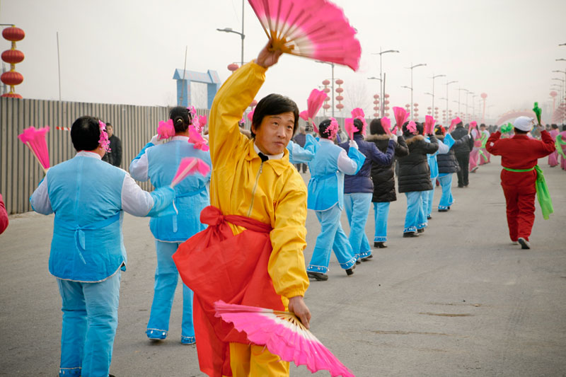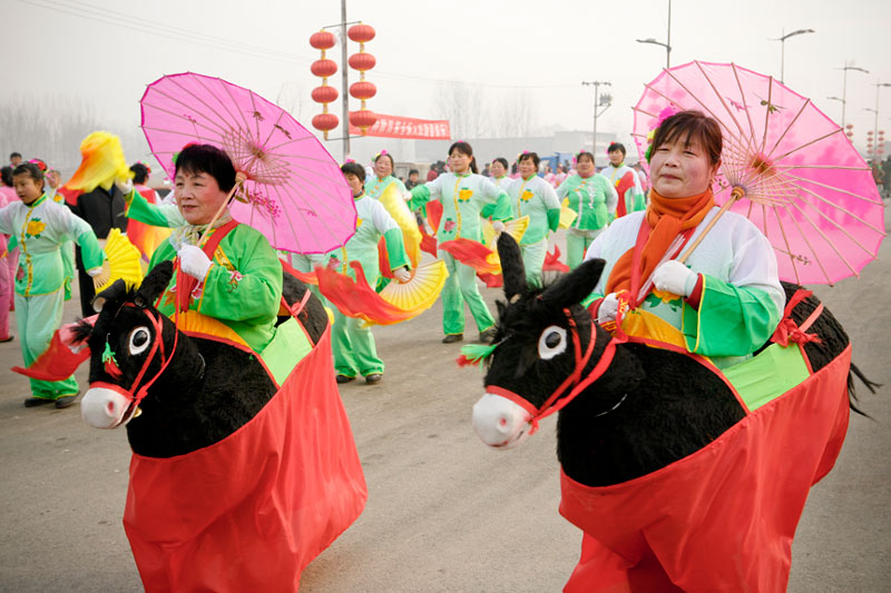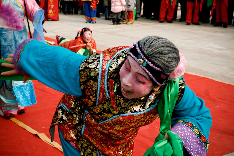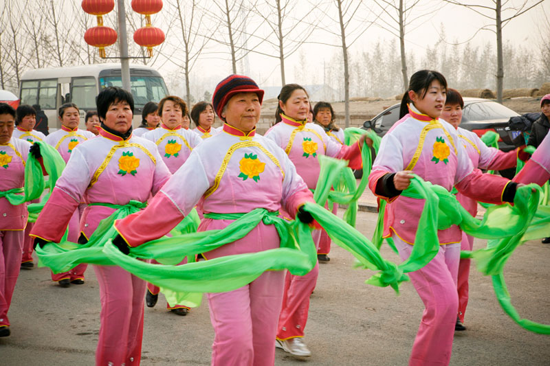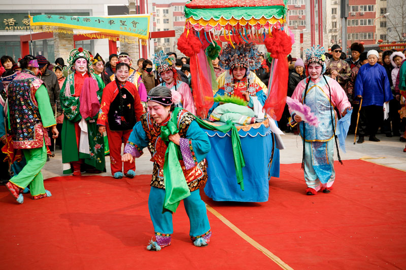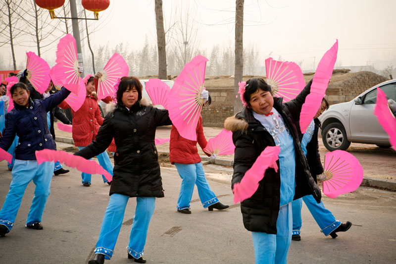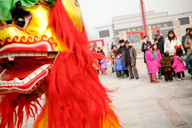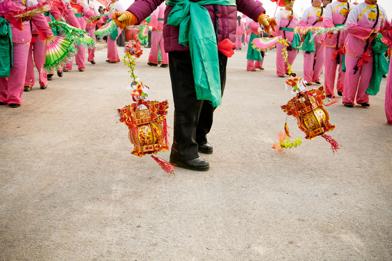 Today people celebrate Lantern Festival in many different ways. These images, captured in a small village outside Beijing, reflect the festival of fifteen small villages. Residents gather to perform, dance, play music, and celebrate the New Year in a community-wide celebration. The most traditional of these performances include the dragon and lion dances, along with fan dances and parades, each done by troupes composed of residents of small neighborhoods. The villagers come adorned in traditional attire representing ancient imperial dynasties while onlookers come to enjoy and participate in the festivities while passing on these traditional Chinese arts to future generations. In light of China's rapid modernization, it is important for these traditions to be passed down to the younger generations, and through community-wide festivals like this, the young are taught the ways of the old.