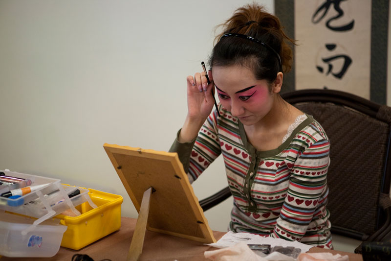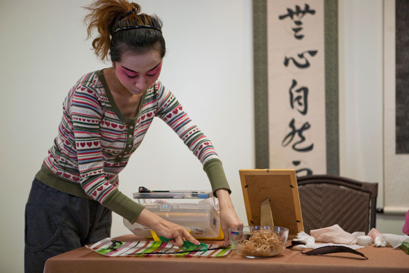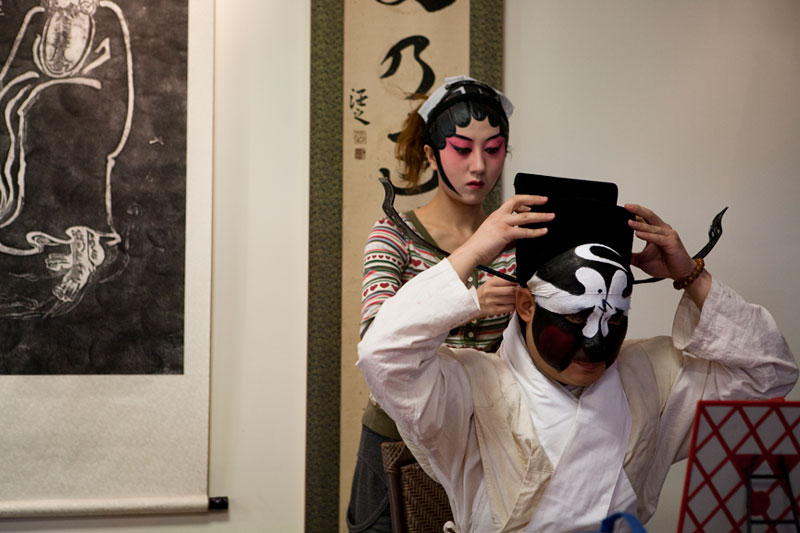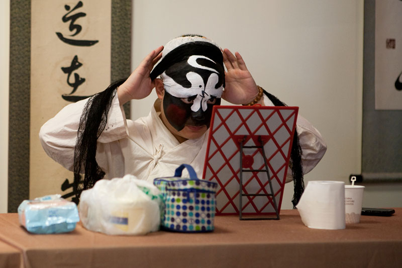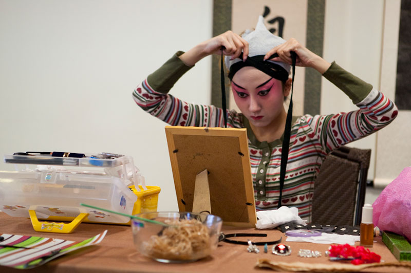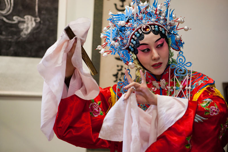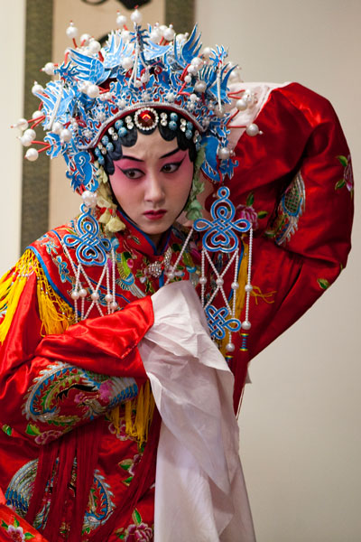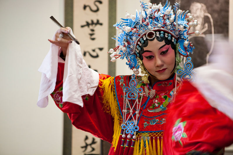 I attended and photographed a Peking Opera workshop designed to help future generations understand and appreciate this ancient custom. The two performers demonstrated the technique of applying their makeup and putting on their costumes in preparation for a performance, and then they demonstrated the Sheng and Dan roles by performing an excerpt from a traditional opera. During their performance, they explained the importance of the gestures, actions, and vocals that are used to enhance the story. In a generation of Chinese youth often obsessed with western culture, Peking Opera is not very popular. But thanks to the dedication of a few individuals committed to its preservation, Peking Opera is gaining renown internationally as troupes travel the world bringing this ancient custom to other countries.